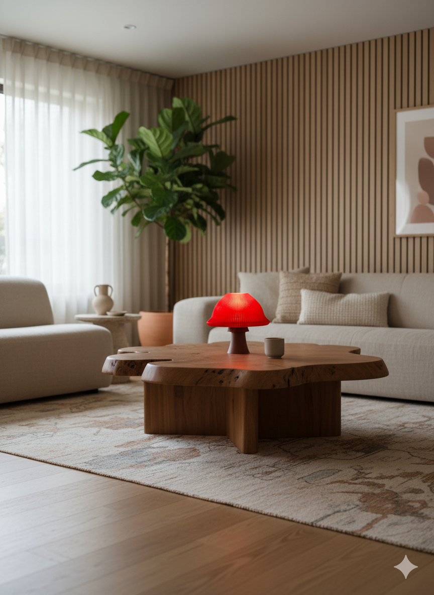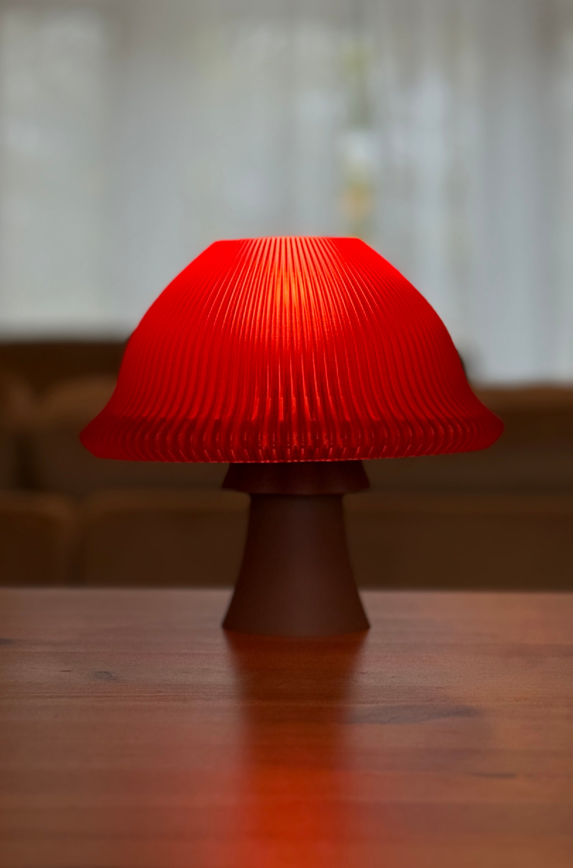 This bold, mushroom-inspired lamp features a glowing red ribbed shade that casts a warm, dramatic light. Its slender base balances the design, making it a striking sculptural accent for any space.