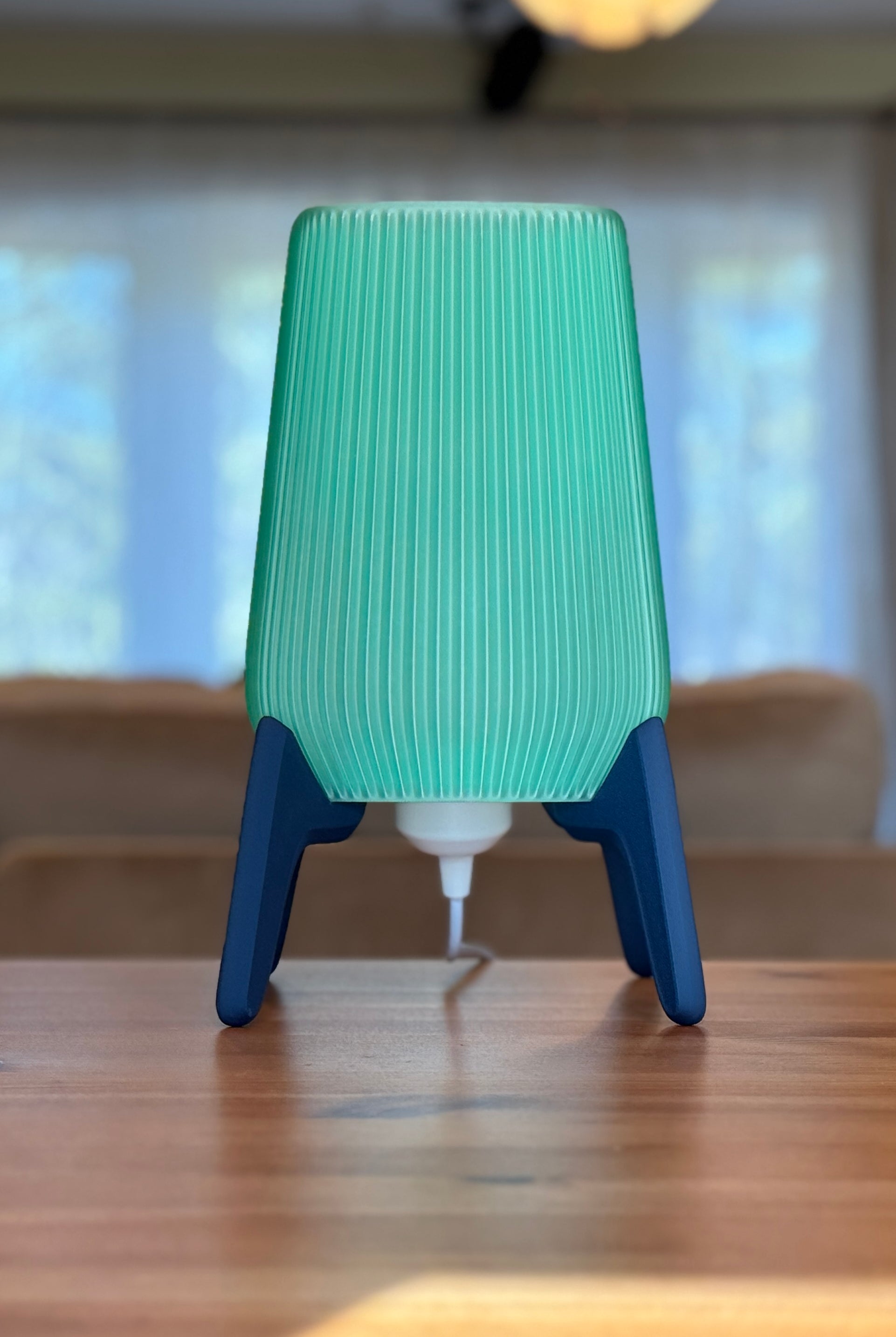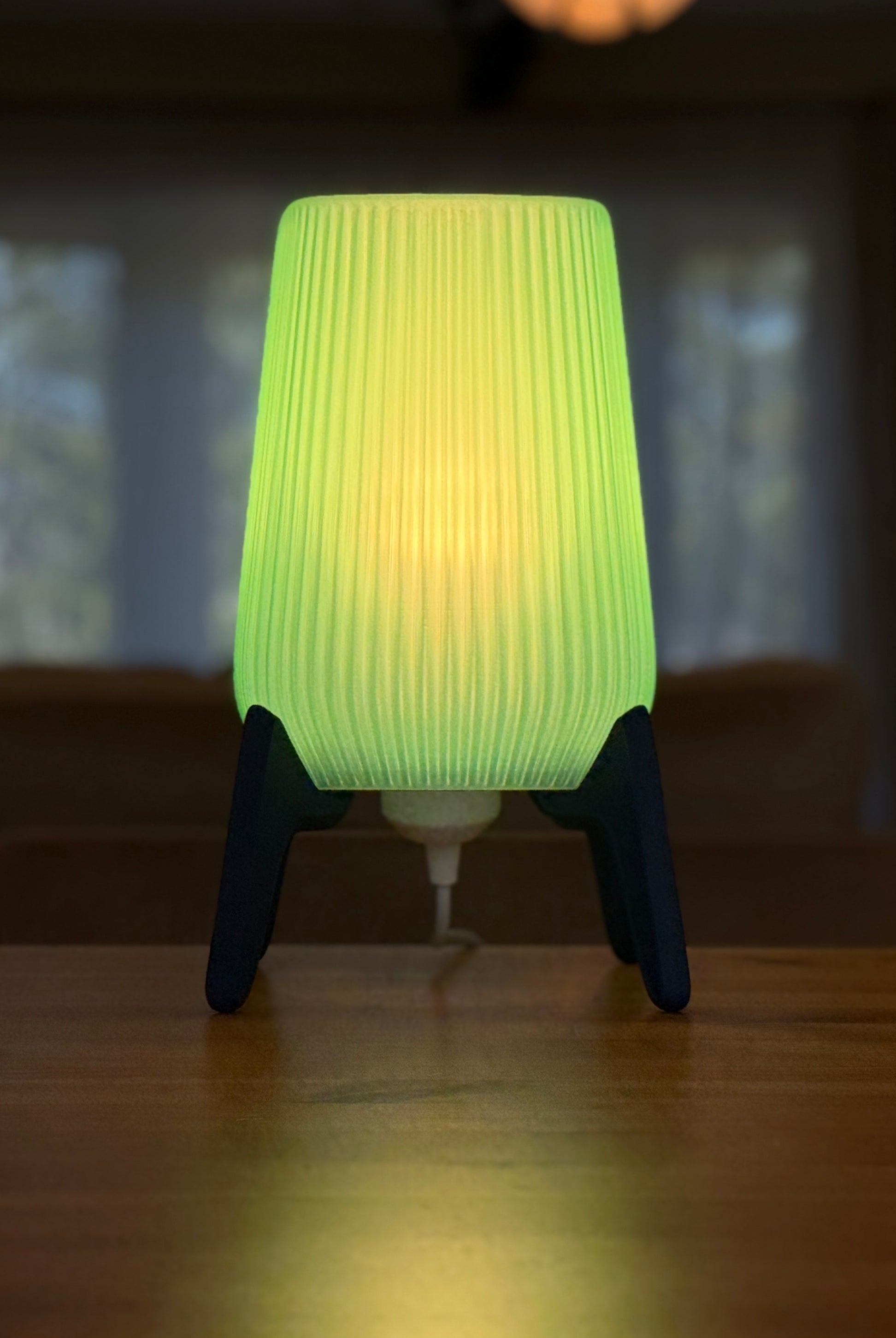 This lamp features a tall, tapered shade with fine vertical grooves that create a soft, textured glow. The light shines through in a gentle green hue, giving it a calming, modern look. It sits on a set of sleek, angled legs that add a touch of minimalist style, making the lamp both functional and sculptural—perfect for a bedside table or cozy corner.