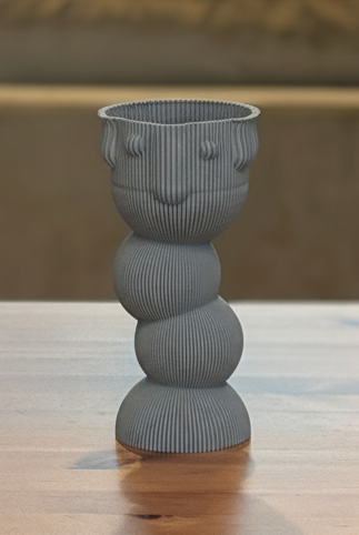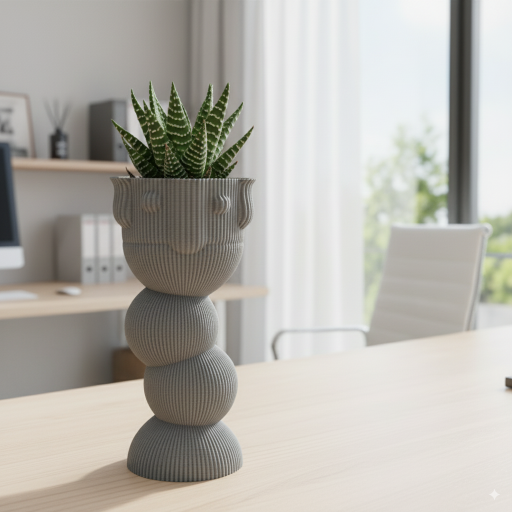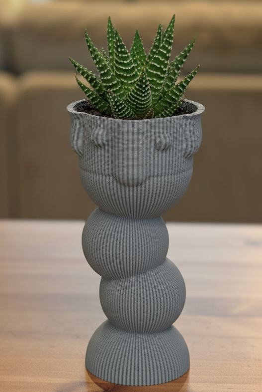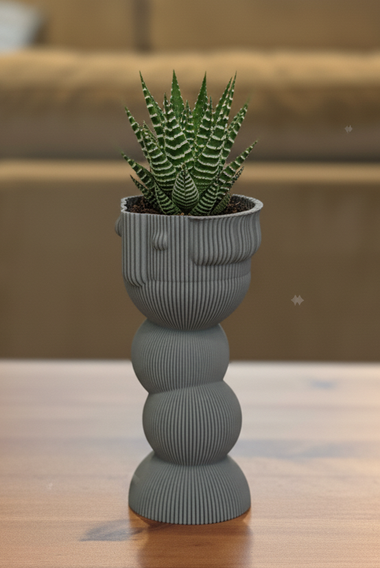 This playful planter is composed of stacked, rounded segments with a ribbed texture that adds depth. The top section features a stylized face, blending modern whimsy with elegance. Perfect for indoor and outdoor plants, it's customizable in your choice of color.