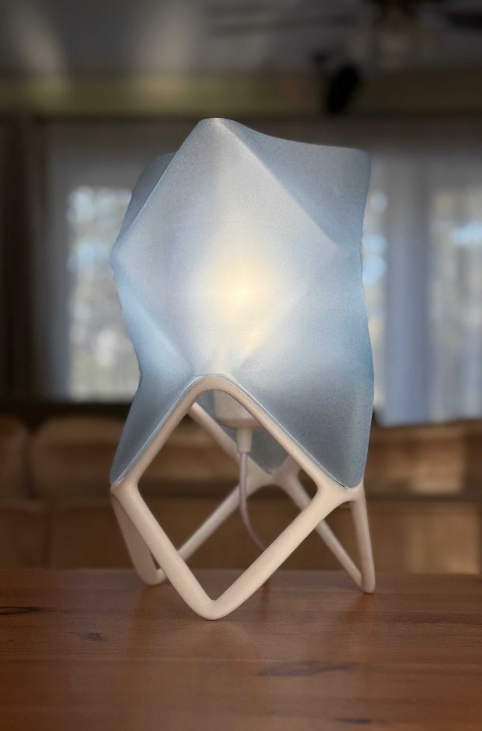 This lamp features a translucent ice blue, origami-inspired shade with soft, folded planes that diffuse light. The translucent material creates a gentle glow, while the geometric open-frame base gives it a light, modern presence. Balanced between art and function, it feels architectural yet organic.