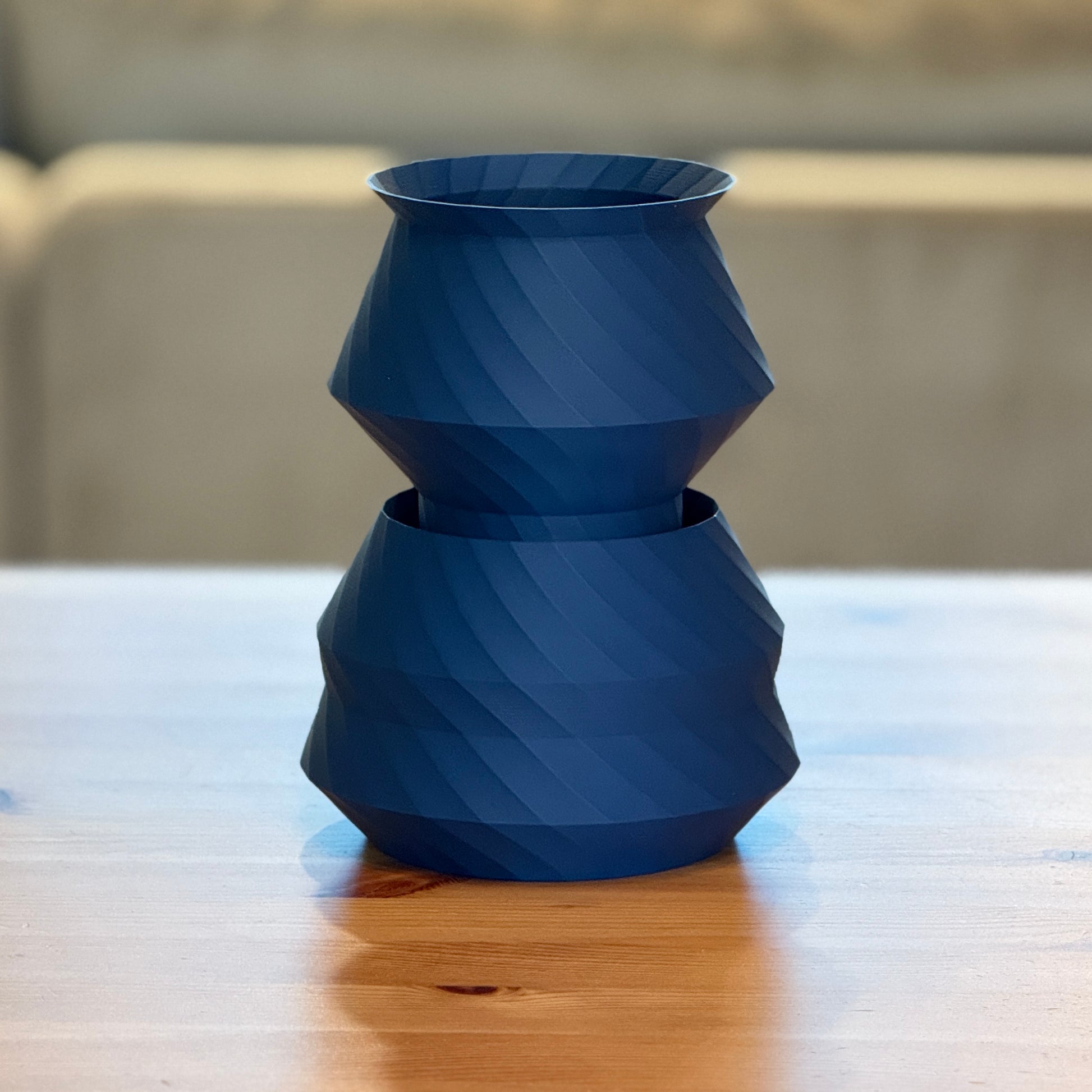 This vase features a stacked, geometric design with two bowl-like sections placed one on top of the other. Each section features a subtle diagonal spiral pattern, adding movement and texture to the smooth surface. Its bold form gives it a modern, sculptural presence, making it a striking centerpiece. Customizable in your choice of size and color, including striped, it's ideal for fresh or dried flowers.