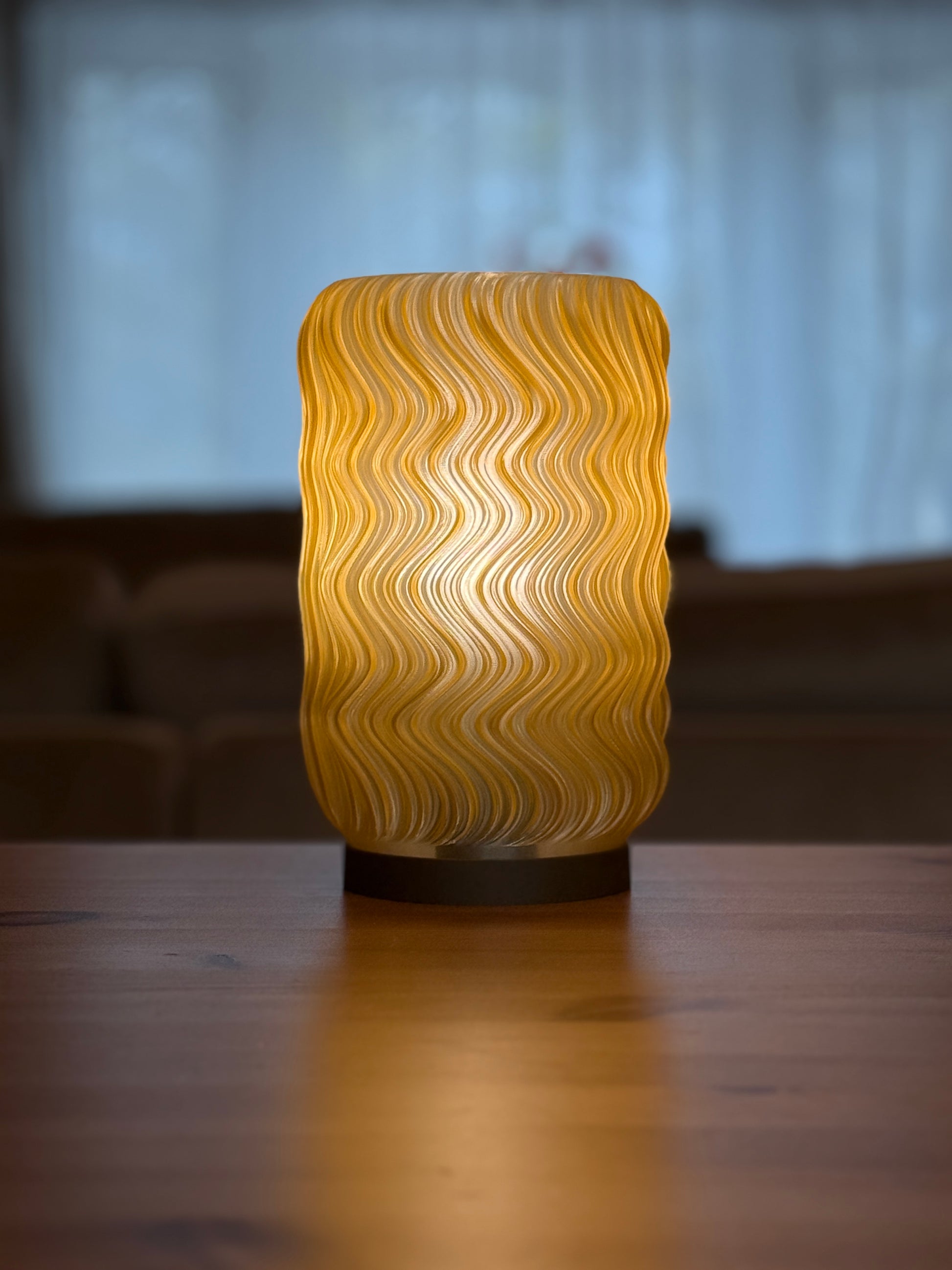 This table lamp features a translucent warm shade with a bold, wavy surface pattern and a dark brown base. When lit, it casts a soft, warm glow that highlights its flowing texture, creating a striking accent.