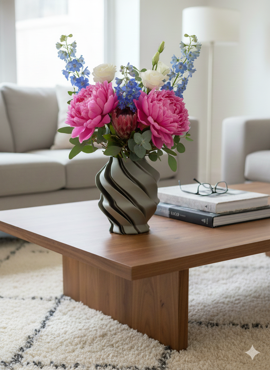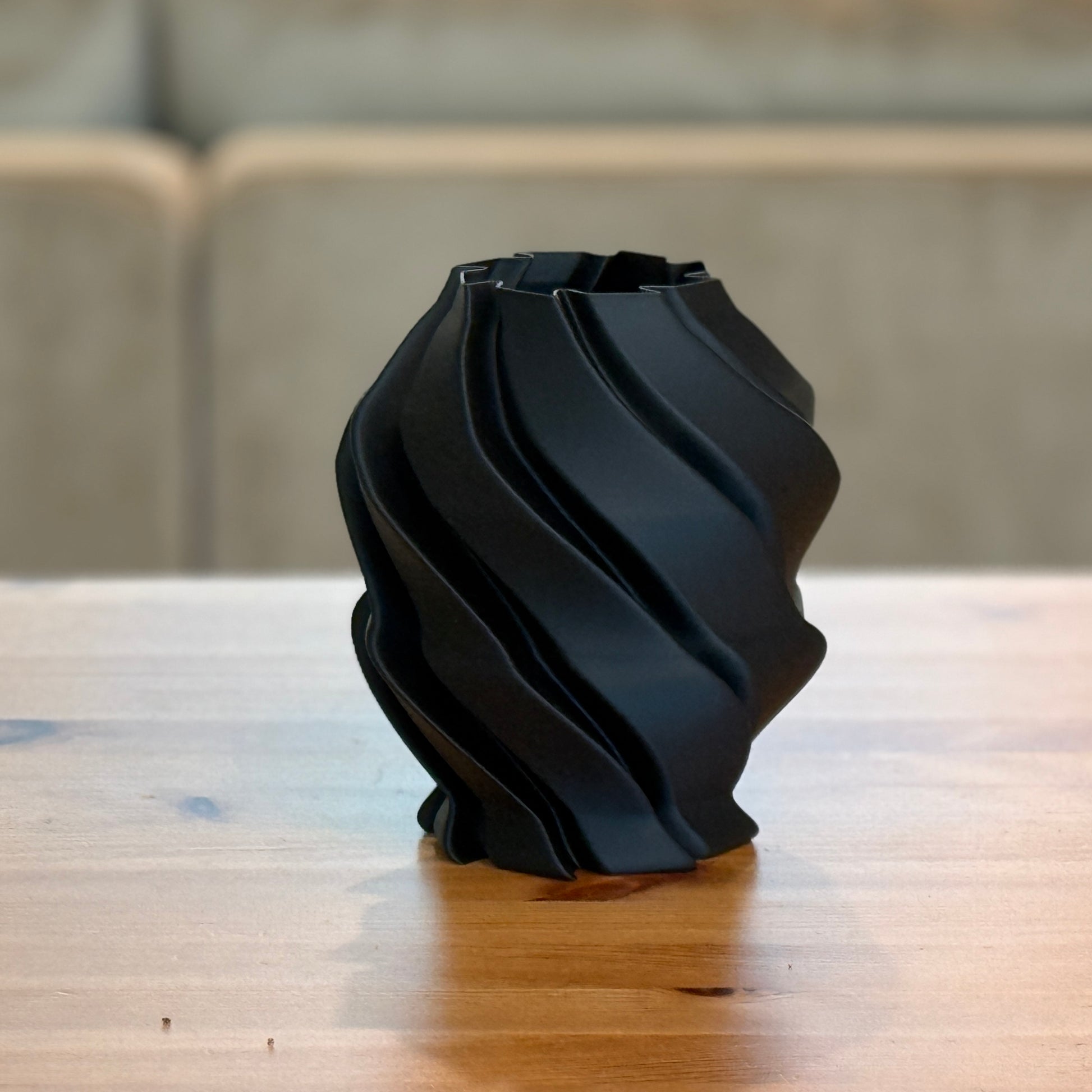 This vase features a bold spiral design with flowing curves. The alternating ridges and recesses give it a wave-like texture, making it both a decorative and functional centerpiece. Customizable in your choice of size and color, it's ideal for fresh or dried flowers.