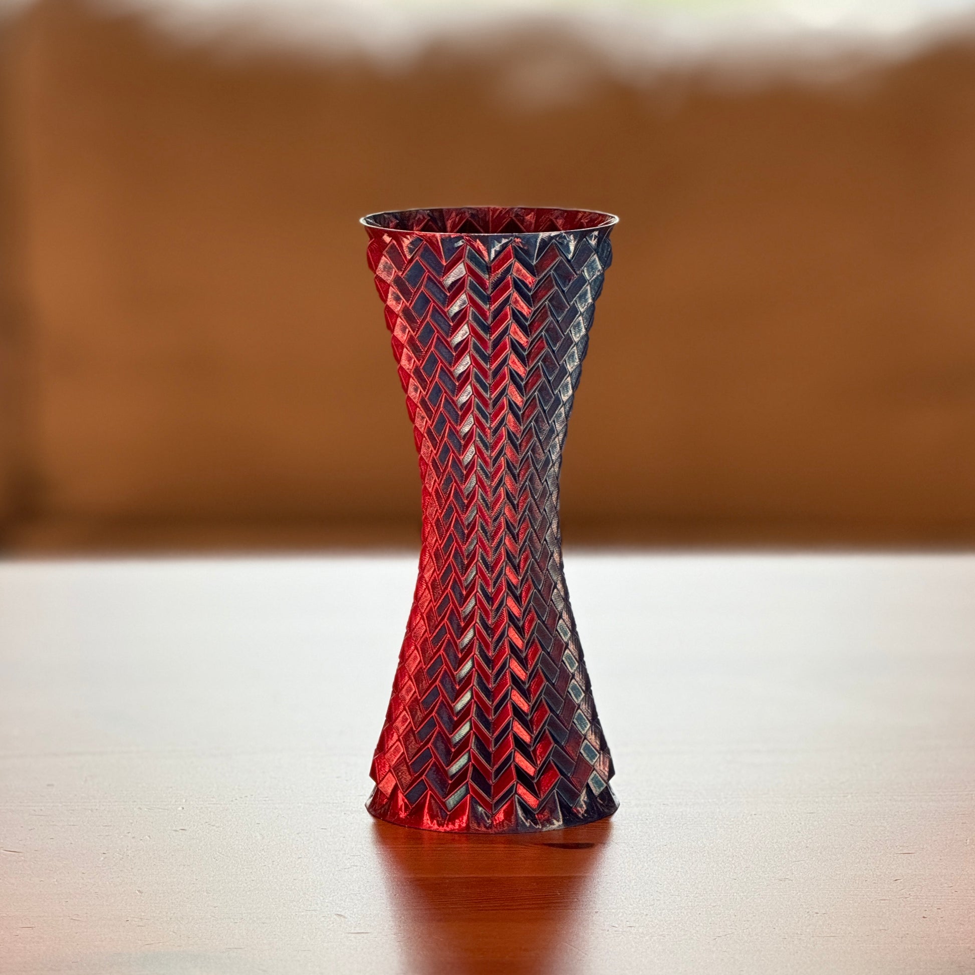 This striking vase features a dramatic hourglass shape and a surface pattern resembling interwoven scales. The texture wraps tightly around the vase, creating a dynamic, almost armor-like effect. Customizable in your choice of size and color, it's suitable for dried or artificial flowers.