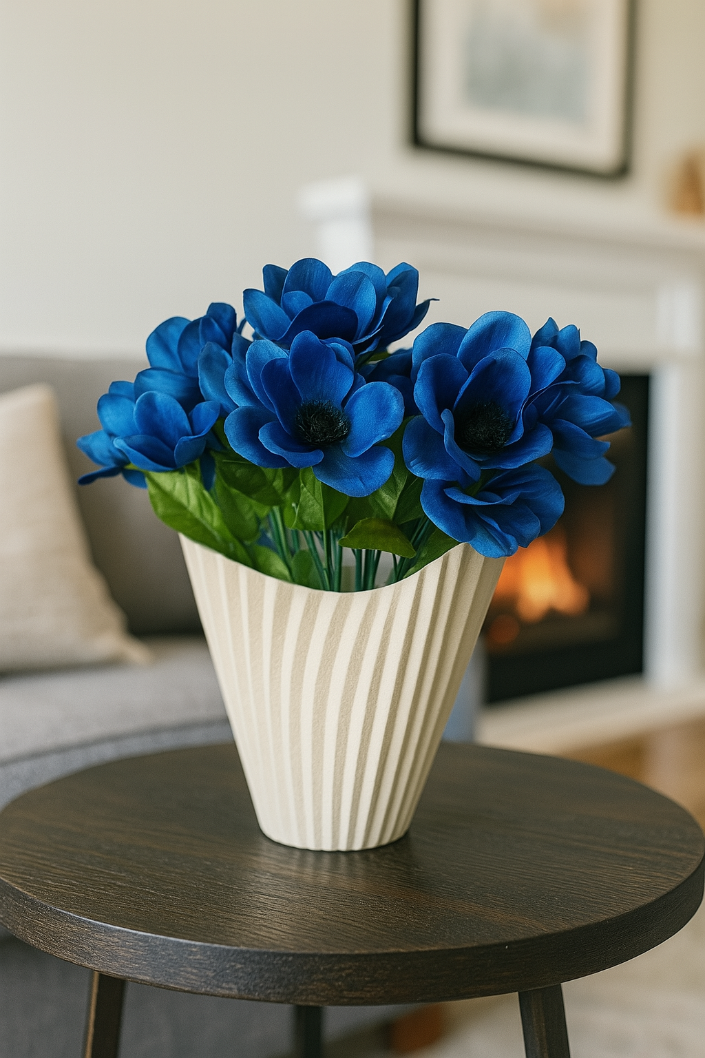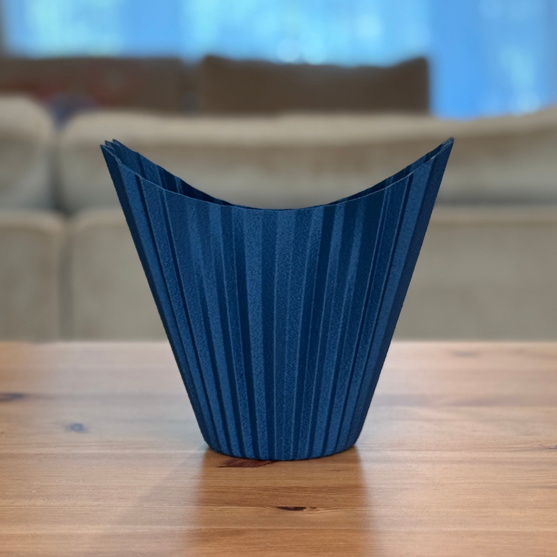 This vase features an eye-catching, fan-like silhouette with a scalloped rim that dips elegantly in the center. Its surface has vertical ridges that create a sense of height and movement, making it a striking piece for dried or artificial flowers. Customizable in your choice of color.